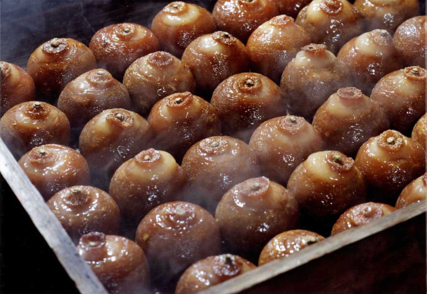 丸柚餅子は長期間の保存が可能な保存食です。製造には最短でも半年を要し、販売されている丸柚餅子のほとんどが2年もの3年ものです。工場出荷時に蒸して軟らかい商品をお届けしますが、日が経つにつれ徐々に硬くなってまいります。硬いものは蒸す、炙る等の熱を加えることによって軟らかくなります。軟らかいものは即座に冷凍することによって軟らかさを保つことができます。軟らかいもの硬いもの、それぞれに味わい深くお好みの硬さで召し上がっていただけます。
