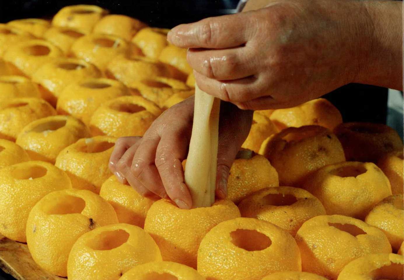 大粒の柚子の中をくり抜き柚子釜をつくり、その中に砂糖と醤油と柚子で練り上げた餅種を入れて蒸し、半年間寝かせることで柚子と餅種を一体に馴染ませて製造します。