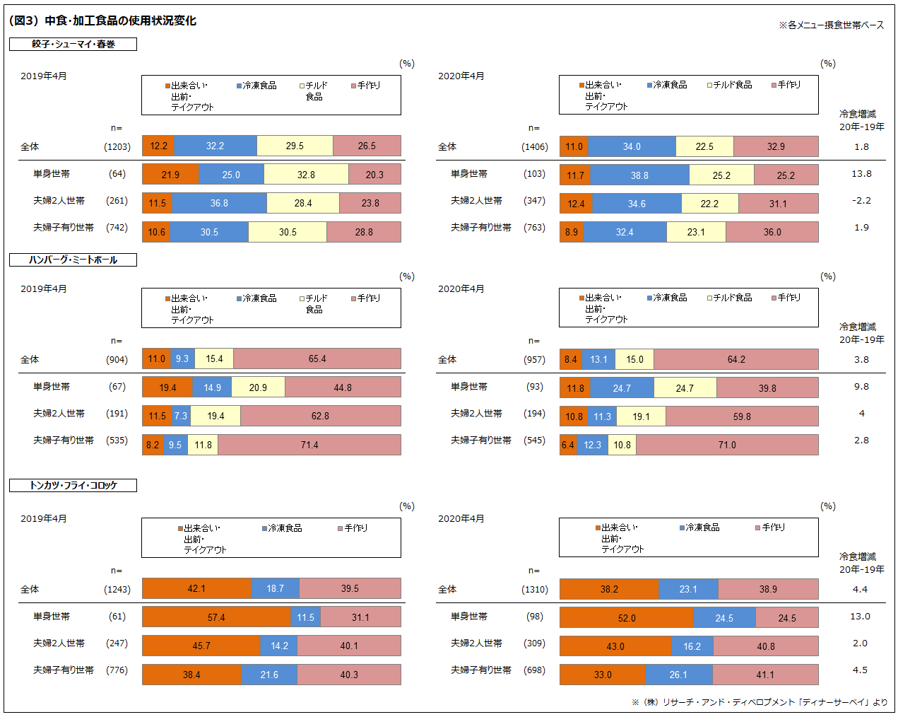 加工食品の利用状況をみると、「餃子類」「ハンバーグ類」「揚げ物類」ともに「冷凍食品」が増加している。世帯タイプ別に見ると、「餃子類」に関してはどの世帯でも「手作り」が増加し、「チルド」の利用が減少している。子有り世帯ではその他のメニューでも「手作り」が増えているが、単身世帯では「手作り」率が下がったメニューが多い。