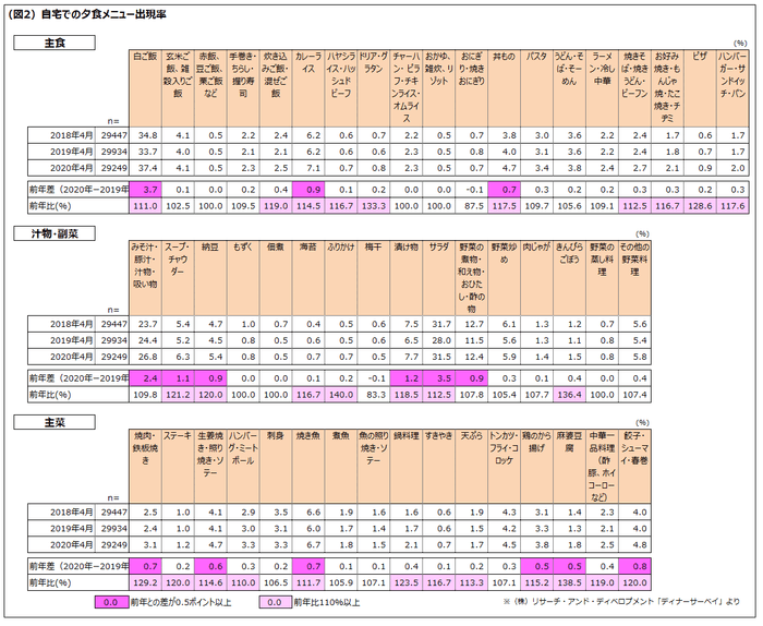 昨年同時期に比べ増えたのは、主食では「白ご飯」「カレーライス」「丼もの」、 主菜では「焼肉・鉄板焼き」「生姜焼き・照り焼き・ソテー」「焼き魚」「餃子・シューマイ・春巻」、副菜では「サラダ」「みそ汁・豚汁・汁物・吸い物」などである。非常事態だからと言っても何か特別なメニューが増えたというわけではなく、「自宅での夕食」機会の増分は、普段食べている定番メニューの増加となったようである。