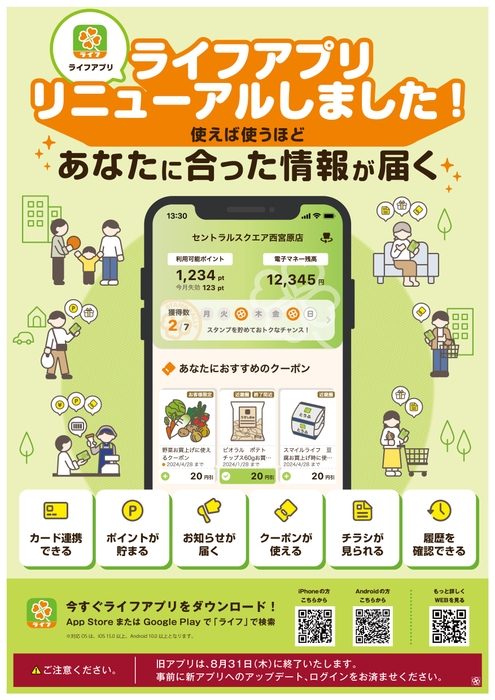 さらに便利で使いやすくなった新・「ライフアプリ」は、アプリのアップデートを実施いただくとご利用になれます。引き続き当社は、「使いやすく」「便利な」アプリをご提供し、アプリを通してお客様と“つながり”、楽しいお買い物環境をお届けできるよう、サービスの向上に努めてまいります。