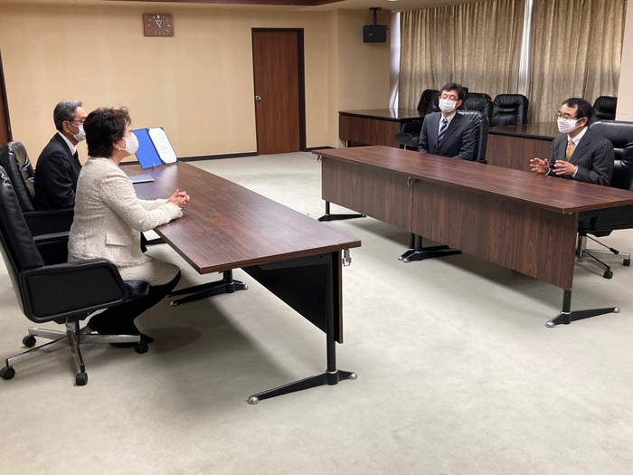 開設に先立ち、同社の代表者である薄井氏とパワーマネジメントデバイス開発ディレクターの深澤氏が11月25日に市役所を訪れ、市長に対して立地表明書を提出し、進出概要などを説明しました。
