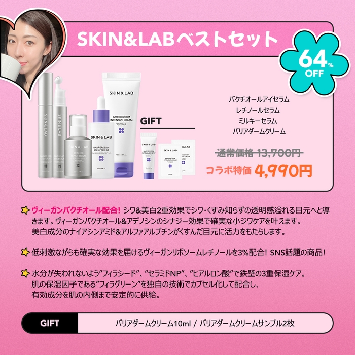 韓国の肌バリア専門ブランド「SKIN&LAB」は、インターネット総合ショッピングモール「Qoo10」にてインフルエンサーのkayo.cosmeさんとコラボし、ブランドの人気商品を集めたお得なコラボセットを販売いたします。2023年7月18日(火)から2023年7月24日(月)まで期間限定で通常よりお得な価格でご購入いただけるほか、サンプルのプレゼントも実施いたします。今回のコラボセットは数量限定のため先着につき無くなり次第終了となります。ぜひこの機会を見逃しなく!