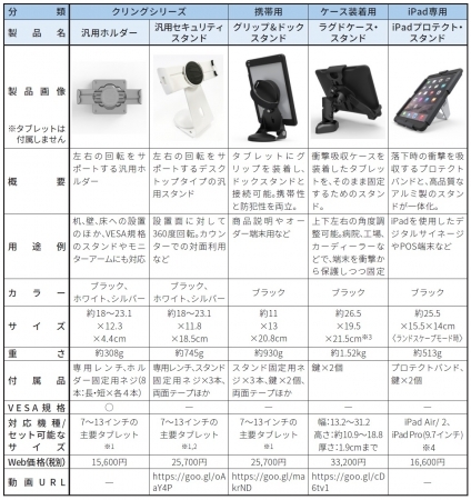 「グリップ&ドックスタンド」は、タブレットにグリップ(取っ手)を取り付けることでドックスタンドに接続可能で、携帯性と防犯性の両立を実現しました。衝撃吸収ケースを装着したままセットできる「ラグドケース・スタンド」、iPad対応の「プロテクト・スタンド」も同時発売します。いずれも盗難防止機構を備え、デザイン性と堅牢性を両立させています。