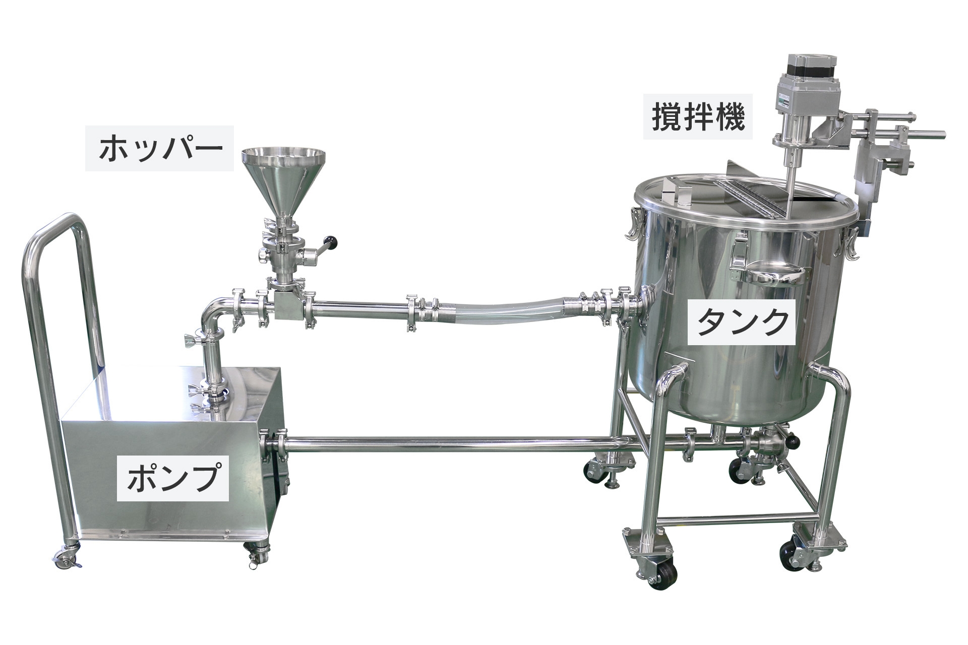 タンクや配管はステンレス製で、錆に強く異物混入リスクを低減。衛生管理が厳しい医薬品・食品工場に適した仕様です。