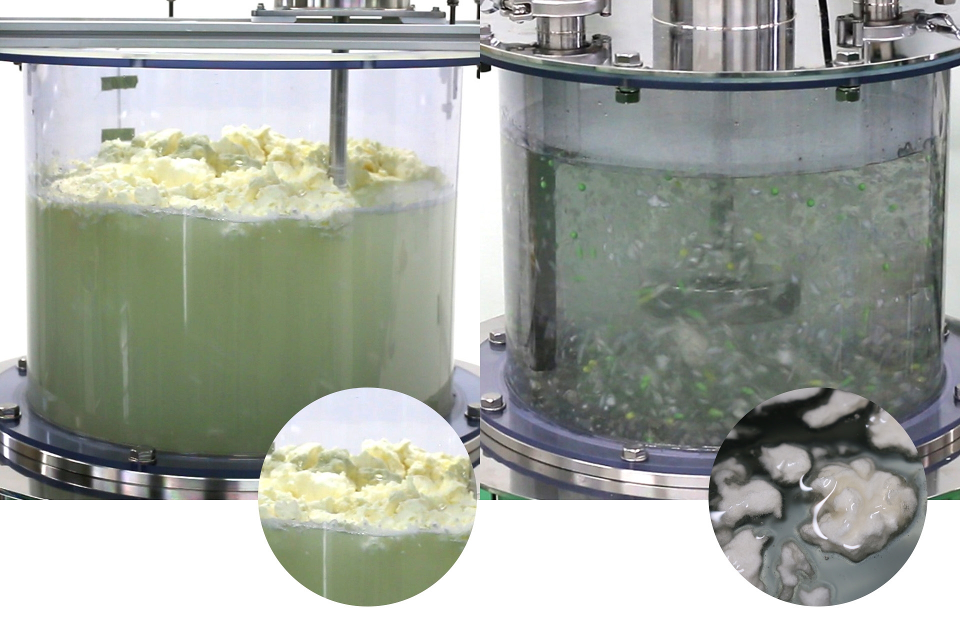 本製品で増粘剤※と水を混ぜたところ、約2分間と短時間の撹拌ですがタンク内に目立つ粉ダマを作らず混ぜることができました。通常、増粘剤は液体に投入するとダマを形成し均一な状態になるまで長時間混ぜる必要がありますが、比較するとその差は明らかです。(比較画像参照)