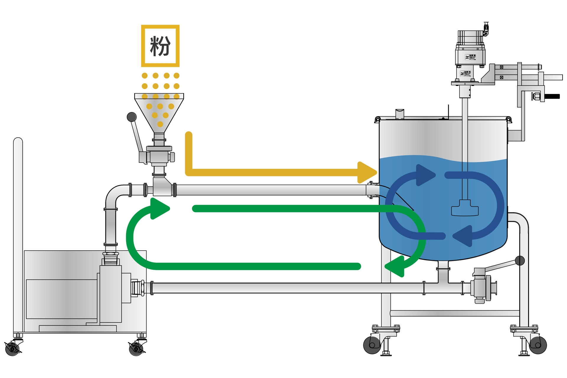 操作は非常にシンプルで、粉はロートへまとめて投入し、栓を開けるだけです。粉はポンプによる液流で自然と配管へ引き込まれ、タンクに入りさらに液体と混ざります。ロートから引き込まれる時に大きな粉の塊は自然と壊れ、ダマの形成を予防します。また粉体を運ぶ配管は液面より低い位置にセットするため、粉が液面に浮くこともありません。