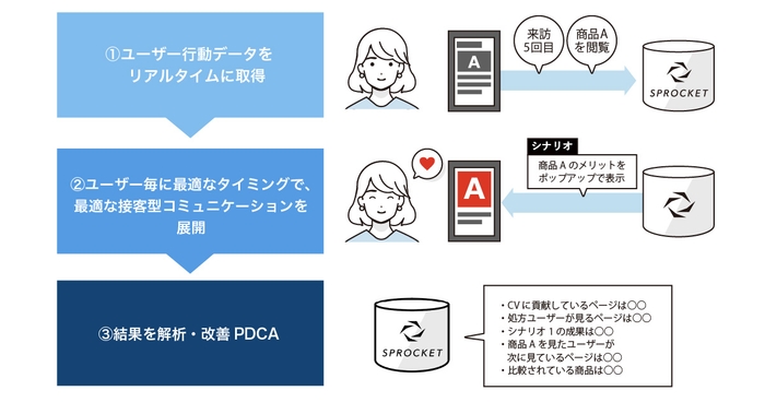 おもてなしデザインプラットフォーム「Sprocket」は、ユーザーのオンライン行動データ(ページ閲覧、スクロール、クリックなど)を活用し、カスタマージャーニーに合わせて最適なタイミングでWebサイト上に接客ポップアップを表示することで、理想的な顧客体験を実現します。ユーザーの態度変容を促し、購入や申し込み、資料請求などのコンバージョン率の向上や、離脱率の低下といったKPIの改善をはかることが可能です。高速でPDCAを回すため、ヒートマップなどの様々な分析機能のほか、一定期間の行動データを学習データとするAI(人工知能)「AutoScoring」など、最先端の機能を搭載しています。シナリオや配信ユーザーセグメントはコンサルタントが作成するため、担当者は重要な意思決定に集中することができます。ECサイトだけでなく、銀行、証券、保険などの金融機関をはじめ、多くの企業のWebサイトで採用されています。