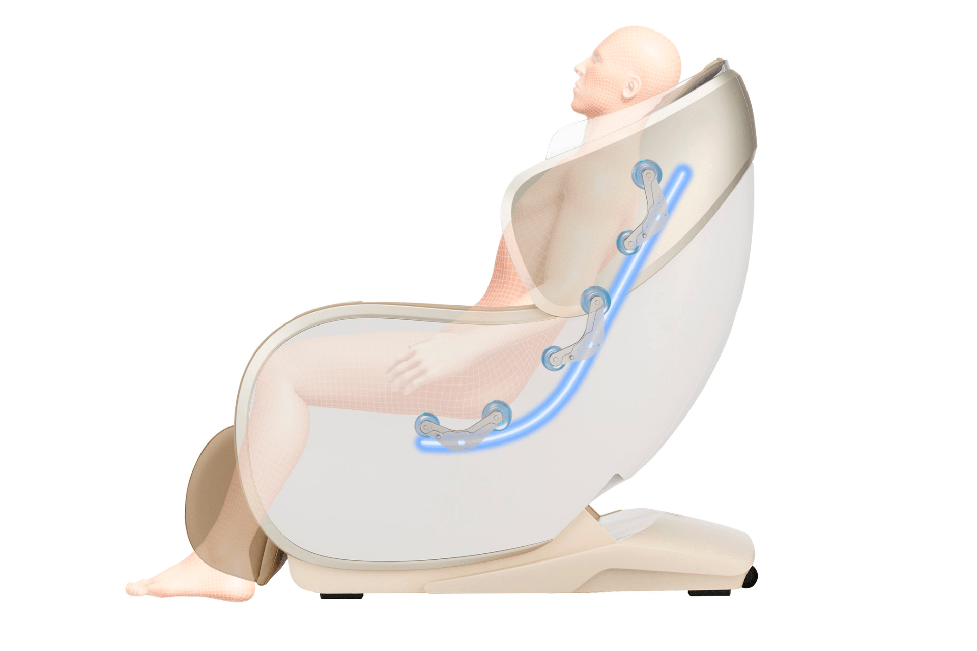 マッサージ機能としては体にフィットしやすい弾力のある素材の独自のもみ玉で、全身をしっかりと揉みほぐす「GRACEメカ」が、首からお尻まで約95cmの幅広い施療範囲を滑らかにマッサージします。腰回りやふくらはぎは、エアーマッサージで包み込むようにほぐします。GRACEメカによる8タイプのもみ技とエアーマッサージを組み合わせた5つの自動コースを搭載し、疲れを感じる部位や目的に合わせお選びいただけます。