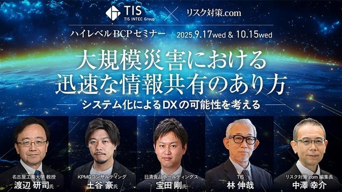 リスクマネジメントとBCPの専門メディアであるリスク対策.com(株式会社新建新聞社)はTIS株式会社と共催で、大規模災害における迅速な情報共有のあり方をテーマとしたBCPセミナーを開催する。開催日は9月17日(水)および10月15日(水)。両日とも同じ内容。
