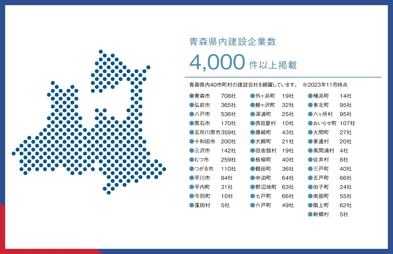 青森県内40市町村の建設企業を約4,000社網羅し、求職者への情報を提供しています。