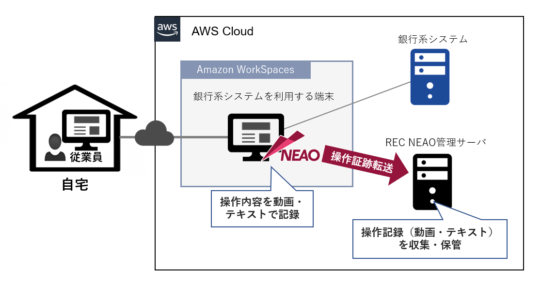 この課題に対しソニー銀行では、既に勘定系システムに当社証跡取得ソリューション「ESS REC」を導入していた実績やAWS上で稼働可能な点などをもとに評価を行い、在宅環境下の操作内容の把握・管理に特化している、当社関連製品「ESS REC NEAO」の採用を決定し、2021年2月、運用を開始しました。