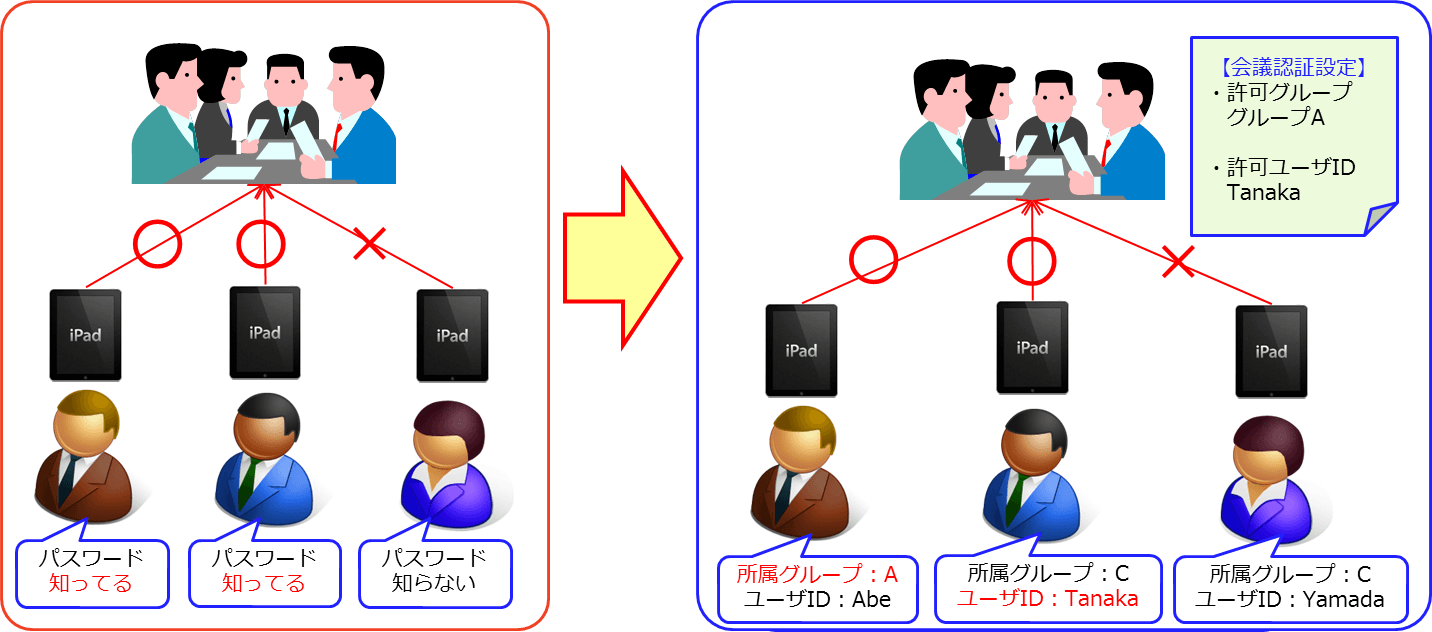 これまで会議参加への認証方法は会議パスワードによる制限のみでした。新しいSONOBA COMETではパスワード制限の他に、ユーザIDの個別指定やユーザグループの複数指定が可能となり、会議の機密性に応じた柔軟な認証設定が可能となりました。