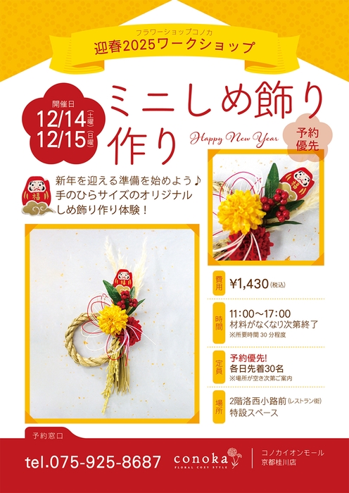 花の総合カンパニー クリエイティブ・フラワー・コーポレーション株式会社(本社:大阪府大阪市、代表取締役社長:松村吉章)が展開するフラワーショップブランド『conoka』コノカイオンモール京都桂川店主催で2024年12月14日(土曜日)、15日(日曜日)の2日間イオンモール京都桂川2階洛西小路前(レストラン街)特設スペースにてワークショップを開催致します。
