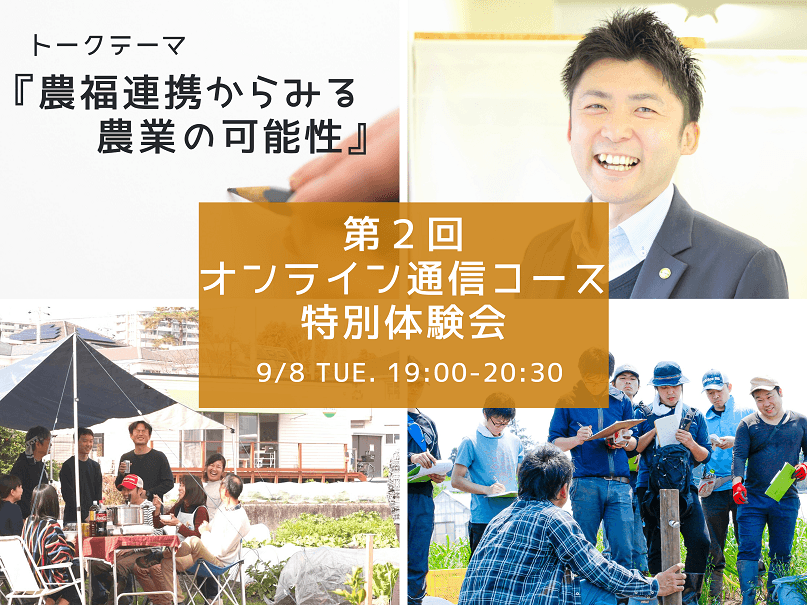 『第2弾オンライン通信コース特別体験会』では、前回参加者からのリクエストが多かった「農福連携」をトークテーマに特別講義いたします。実際に企業の農福連携事業立ち上げから運用フェーズまでを手掛けたことのある講師による表と裏を直接聞くことが可能です。これからの日本社会で重要な農業と福祉の可能性を一緒に探りましょう。