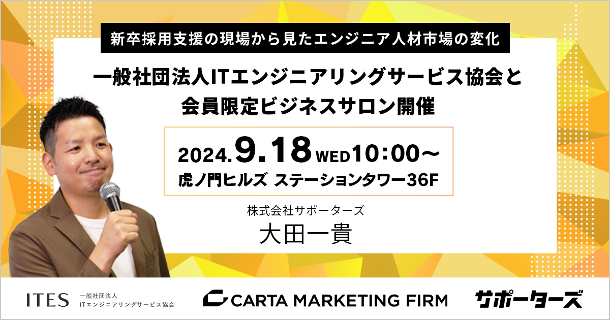 株式会社CARTA HOLDINGS(以下、CARTA HD)のグループ会社で、マーケティング特化の事業を展開する株式会社CARTA MARKETING FIRM(東京都港区虎ノ門、代表取締役:西園 正志、以下CARTA MARKETING FIRM)は、エンジニア業界全体の成長と知名度向上、バリューの追求・推進を目的に、2024年9月18日、一般社団法人ITエンジニアリングサービス協会(東京都千代田区、代表理事:橋田 博明、以下ITES)と共同で、ITES会員限定ビジネスサロンを開催します。