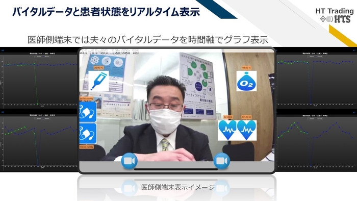 医務室にて:医師は、バイタルサインをもとに、患者とビデオ通話を通じて非接触で医療行為を実施します。