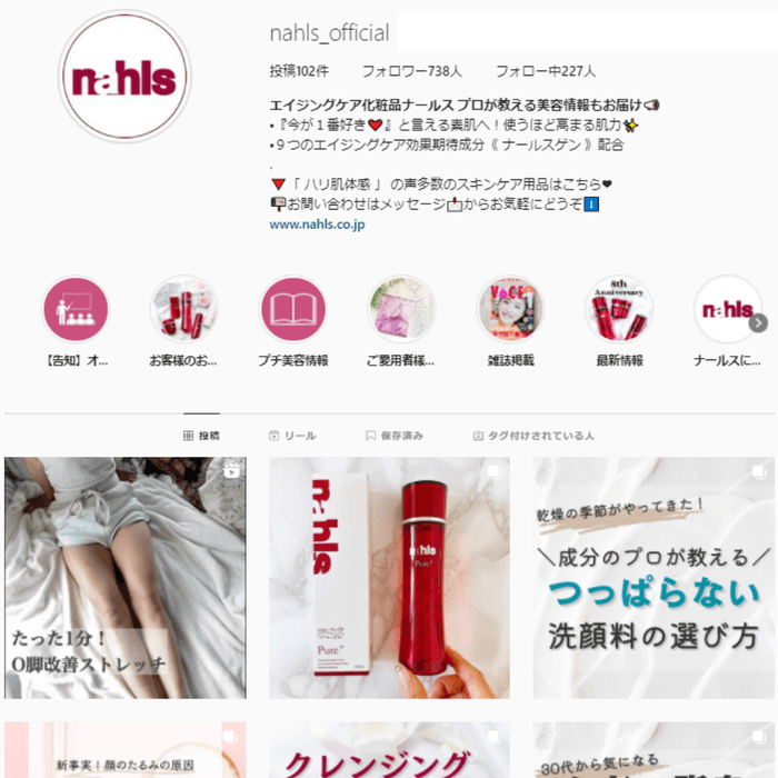 ⑤ストーリーズにて月に1度実施しているオンラインセミナーの告知や@nahls_officialの役に立たった美容情報をシェアしていただける方