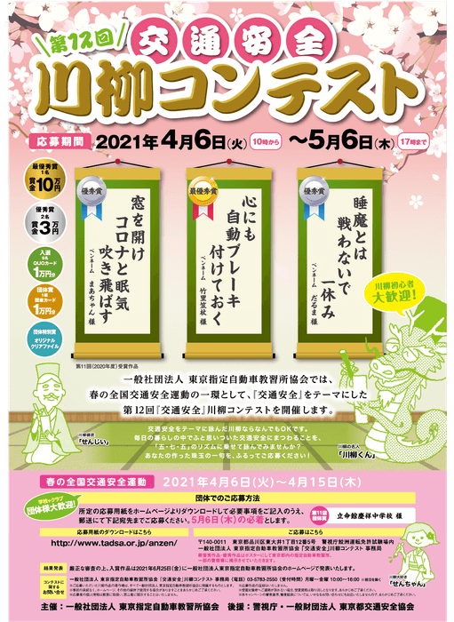 一般社団法人 東京指定自動車教習所協会(本部:東京都品川区、以下 東京指定自動車教習所協会)は、警視庁、一般財団法人 東京都交通安全協会の後援をいただき、2021年4月6日(火)より「春の全国交通安全運動」の一環として、交通安全にまつわることを詠んだ、第12回「交通安全」川柳コンテストを開催いたしますので、下記のとおりお知らせいたします。
