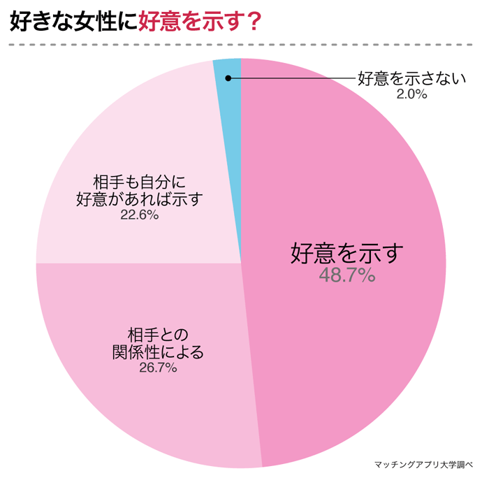 「好きな女性に好意を示しますか?」と質問したところ、1位は「好意を示す(48.7%)」でした。2位は26.7%で「相手との関係性による」、3位は22.7%で「相手も自分に好意があれば示す」でした。条件次第では約98%のO型男子が好きになった女性に好意を示すことが分かりました。