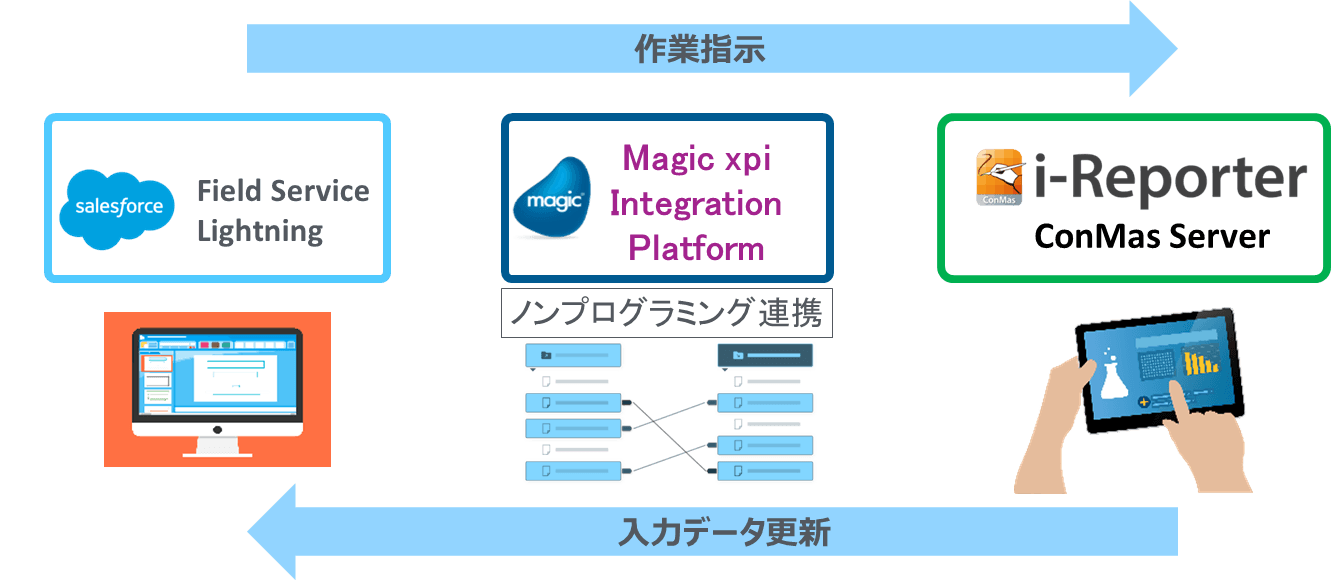 データ連携プラットフォーム『Magic xpi Integration Platform(マジックエックピーアイ・インテグレーションプラットフォーム、以下 Magic xpi)』と電子帳票ソリューション『ConMas i-Reporter(コンマス・アイレポーター)』の連携により、顧客接点の最前線から顧客管理までの情報連携ソリューションとしてお客様に提供し、フィールドサービスの効率化とカスタマーエクスペリエンスの向上に貢献してまいります。