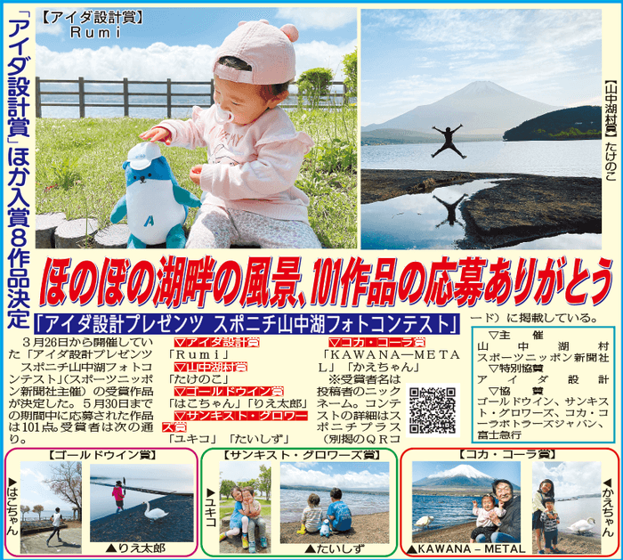 3月26日から5月30日まで開催していた「アイダ設計プレゼンツ スポニチ山中湖フォトコンテスト」(スポーツニッポン新聞社主催)は受賞作品8点を決定、4日(金)付スポニチ紙面で発表しました。