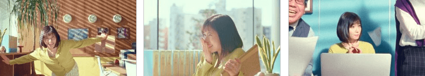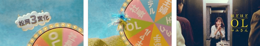 松岡茉優さん扮するほどほどOL「マユさん」の、気分の変化とコーディネートにご注目ください。