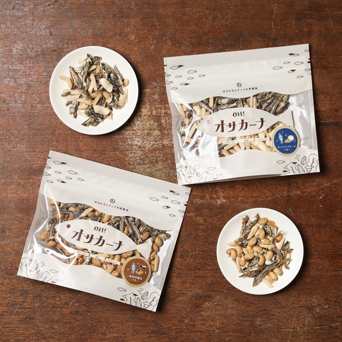 ぽりぽりが止まらない美味しさで栄養もたっぷりのオサカーナシリーズは種類も豊富で、いりこ&アーモンド、昆布ミックス、みそ大豆ミックス、シーフードミックス、チーズミックス、わさび仕立て、オリーブオイル仕立て、紀州梅仕立て、塩レモン仕立て、なないろチーズカレー、焼き安納スイートポテト味を販売しており、累計70万袋を突破する人気商品となっております。