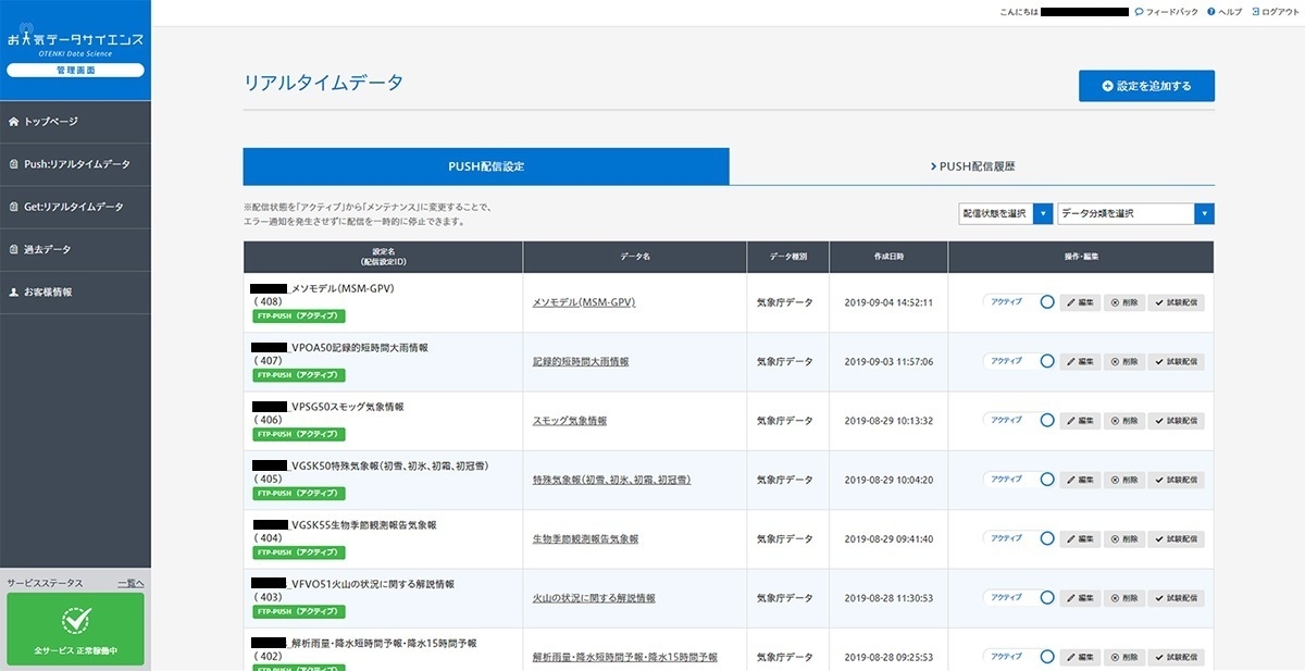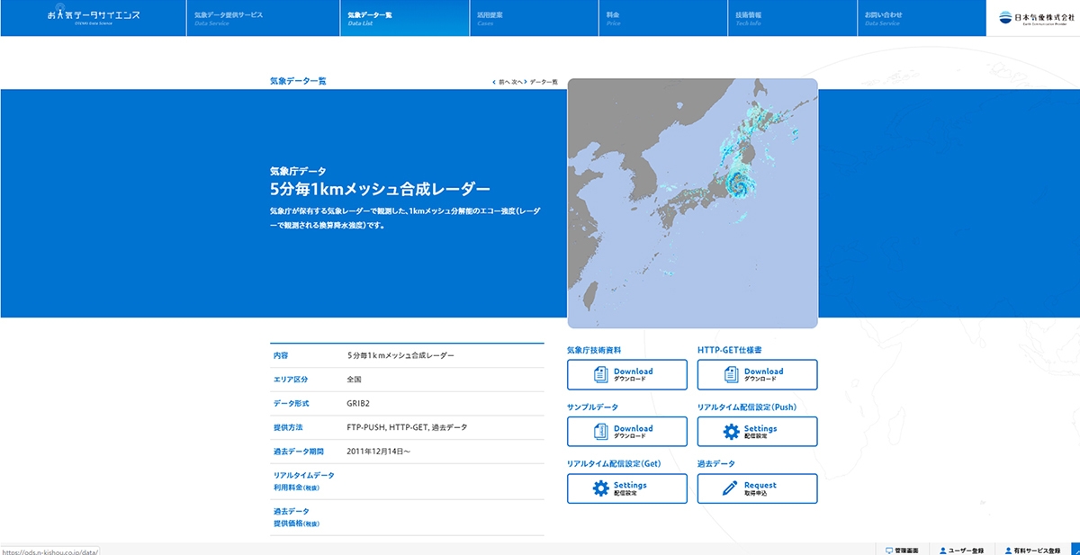 「お天気データサイエンス」では、現在約200種類の気象データを、Web上の管理画面から簡単な操作で受信設定することができます。データは加工や分析をしやすい形式で、誰でも欲しいデータを必要なタイミングですぐに利用開始することができるため、開発や作業の効率化をはかることができます。品質や精度にこだわった日本気象独自のデータ等を、信頼性の高い配信システムで提供します。