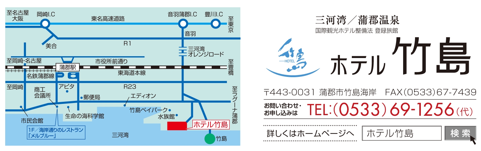 ホテル竹島は愛知県蒲郡市のシンボル「竹島」の目の前、美しい三河湾国定公園内に立地する蒲郡市を代表する温泉リゾート旅館です。