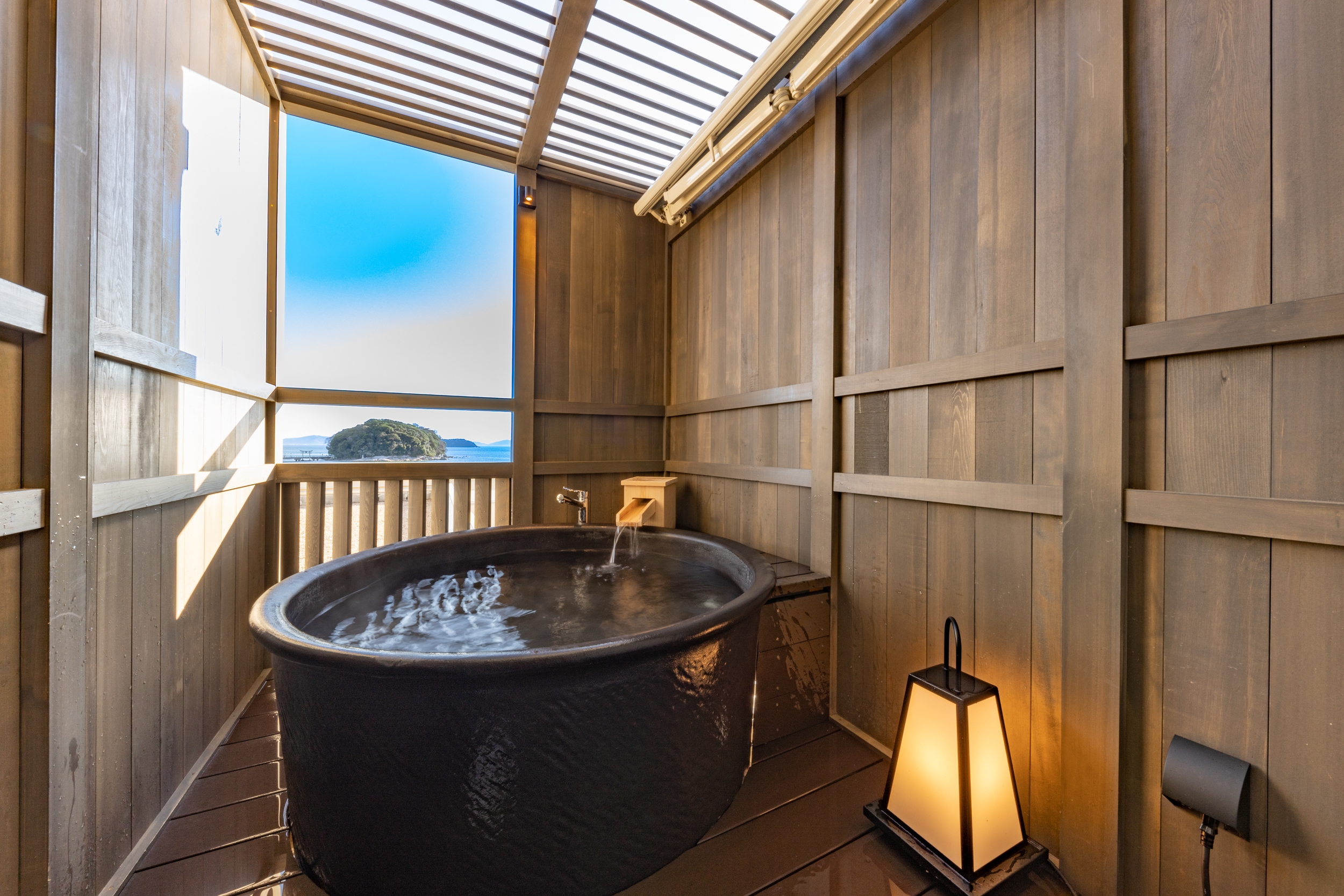 各お部屋にはゆったりと景色を眺めながら温泉に浸かれる陶器の露天風呂。