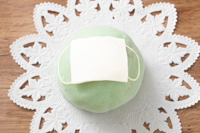 「サマージャンボマスク大福」は、ジャンボ宝くじにちなんで、通常のいちご豆大福およそ3個分というジャンボサイズで創作。中身のメロンは今が旬の熊本産(※)を贅沢に使用(約80g)し、メロンの甘みを引き立てる上品な白あんと涼しげなメロン色の柔らかい生地で包みました。また、真っ白なマスクは上生菓子にも使われる「雪平」という餅生地で作り、ひもの部分には素麺生地を使っています。