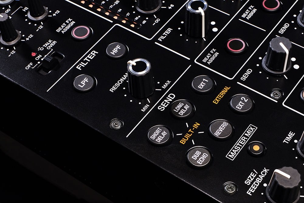 『DJM-V10』は、LPF(LOW PASS FILTER)とHPF(HIGH PASS FILTER)の切り替えが可能なFILTER専用のノブを各チャンネルに搭載したことにより、確実な操作でダイナミックに音を変化させることができます。さらにSENDノブの搭載により、各チャンネルの音を本機に内蔵されたDelayやReverbなどの残響系エフェクトや、外部に接続されたエフェクターなどへ送ることで、様々なエフェクターを駆使した独創的なパフォーマンスを直感的に実現できます。