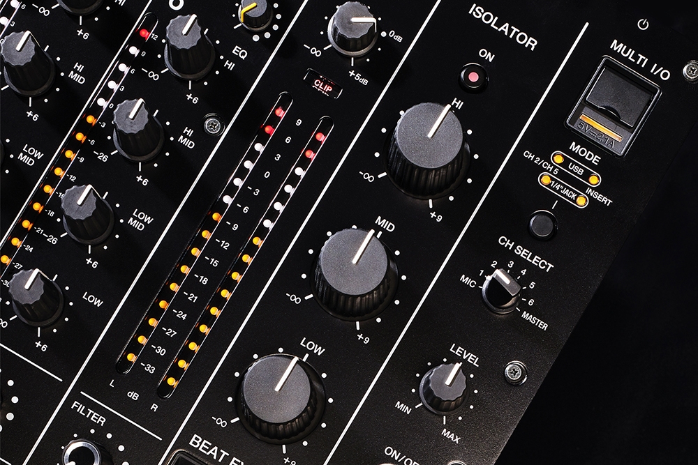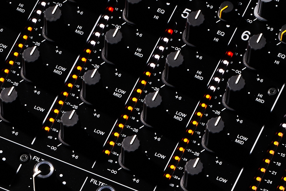 『DJM-V10』の目指す音質を定義し、パーツの再選定など細部にわたりチューニングを施すことにより、大音量でも心地よくいつまでも踊り続けていられるような音質を実現しました。また、4バンドEQの搭載により各帯域の音を細部までコントロールできるので、繊細なミックスを行うことができます。さらに各チャンネルに搭載したコンプレッサーにより、年代やジャンルを越えたミキシングやマスタリング状態の異なる音源をより自然にミックスすることができます。