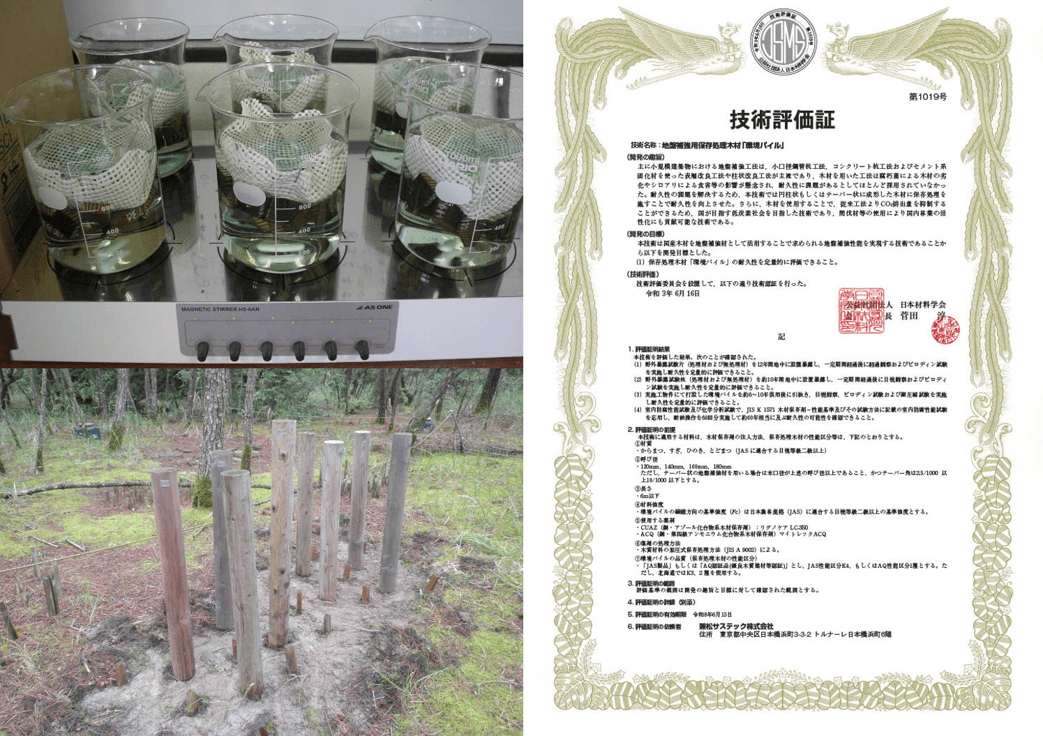 地盤調査・地盤改良事業など住宅・建材に関わる業務を行う兼松サステック株式会社(所在地:東京都中央区、取締役社長:高崎 實、東証一部 証券コード:7961)は、自社工法である『環境パイル工法』、『環境パイルS工法』で使用する地盤補強用保存処理木材『環境パイル』の耐久性について、公益社団法人日本材料学会の『地盤改良に関わる技術認証制度』に評価申請を行い、技術評価されました。(評価証明番号:第1019号)