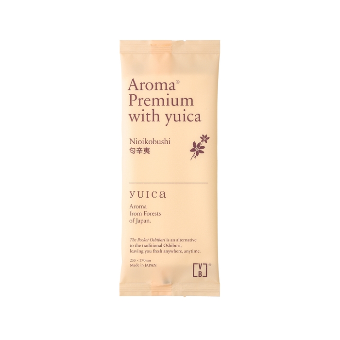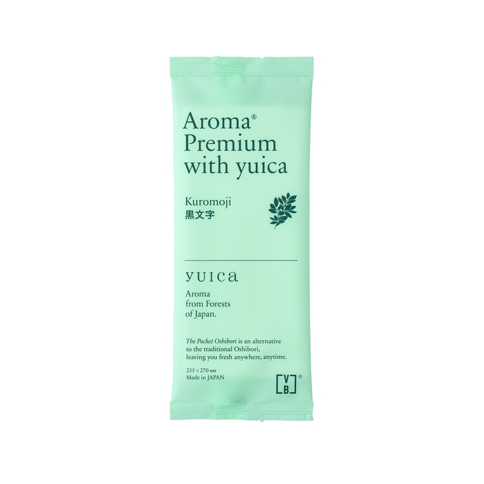 新発売の『Aroma Premium with yuica』は、おしぼりと肌との関係に着目して開発された新技術『VB-COSME-』(特許第7278638)により、エイジングケアをサポートする機能を備え、肌を洗浄し、整え、潤いを与える効果が認められています。また手指だけでなく、体や顔を含む全身にご使用いただけることで、従来品に比べて、使い続けたい「拭き心地の良さ」を感じていただける商品に仕上がっています。パッケージは、香りの上質さとVB技術の確かさのバランスを意識したデザインに一新したほか、環境に優しいバイオマス10%配合フィルムを使用しています。また、香りを封じ込める独自開発のプロテクトフィルムにより、消費期限が1年半(当社調べ従来比300%)に延びるなど、新鮮な森の香りを長く楽しんでいただけるポケットおしぼりが出来上がりました。