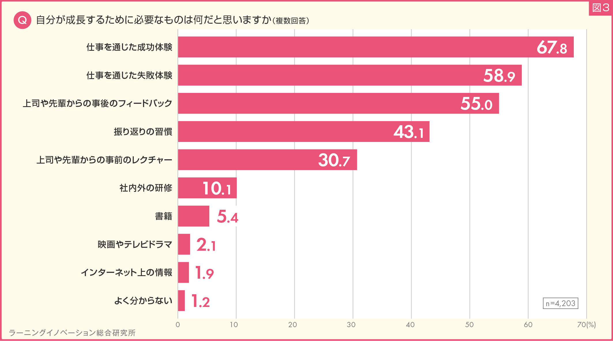 - 自分の成長に必要なもの1位「成功体験」、2位「失敗体験」、3位「事後フィードバック」