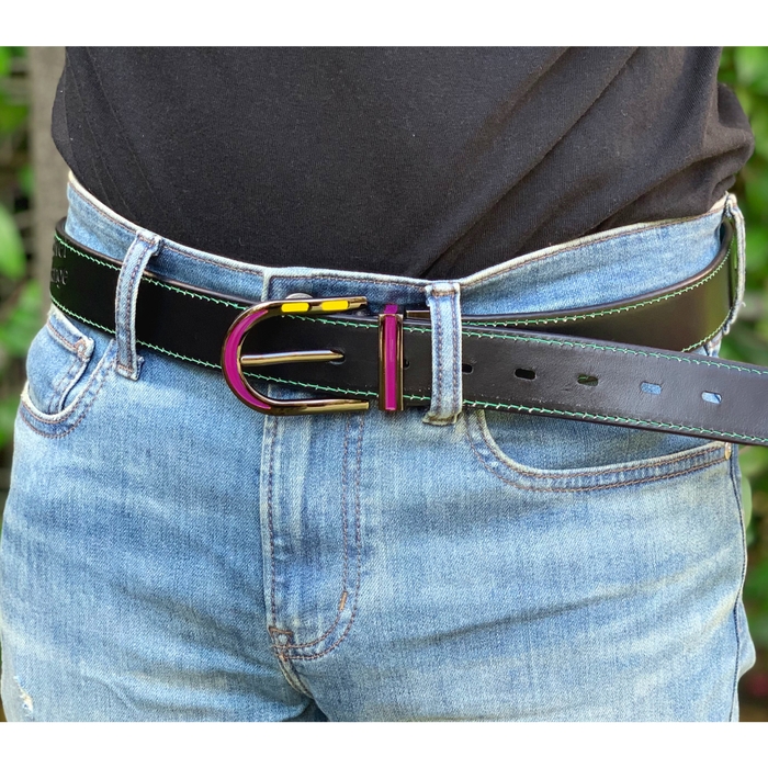 ヘッドフォンをモチーフとした回転式バックルを搭載することにより、リバーシブルで楽しめる本革ベルトです。