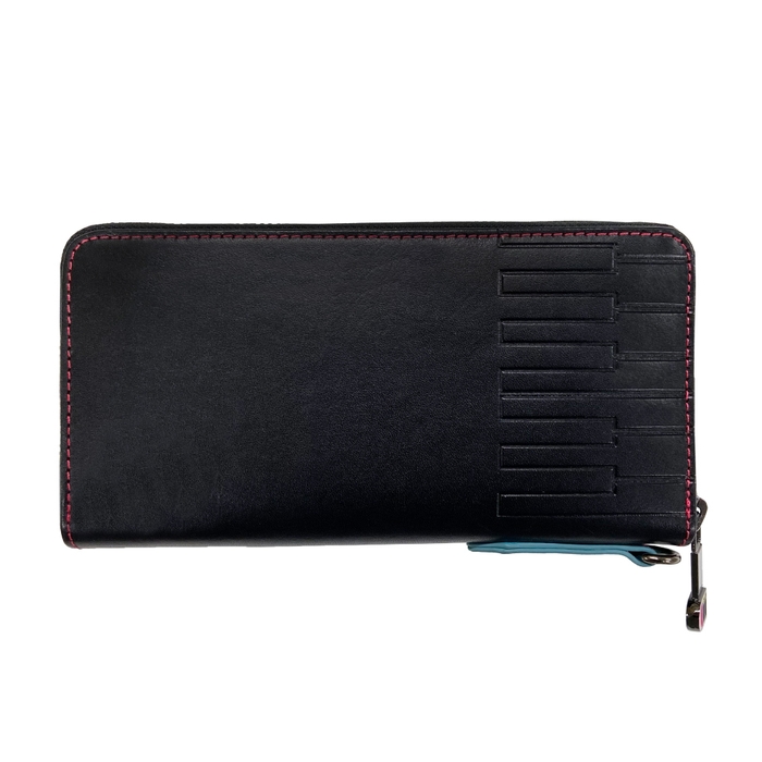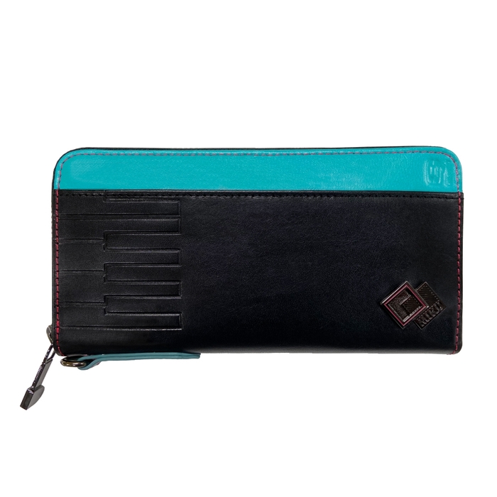 ミクのカラーリングとポイントが随所にちりばめられた本革のラウンド財布。ネクタイ型のパーツにはオプションのウォレットコードをはじめ、お気に入りのキーホルダーなどをつけられます。