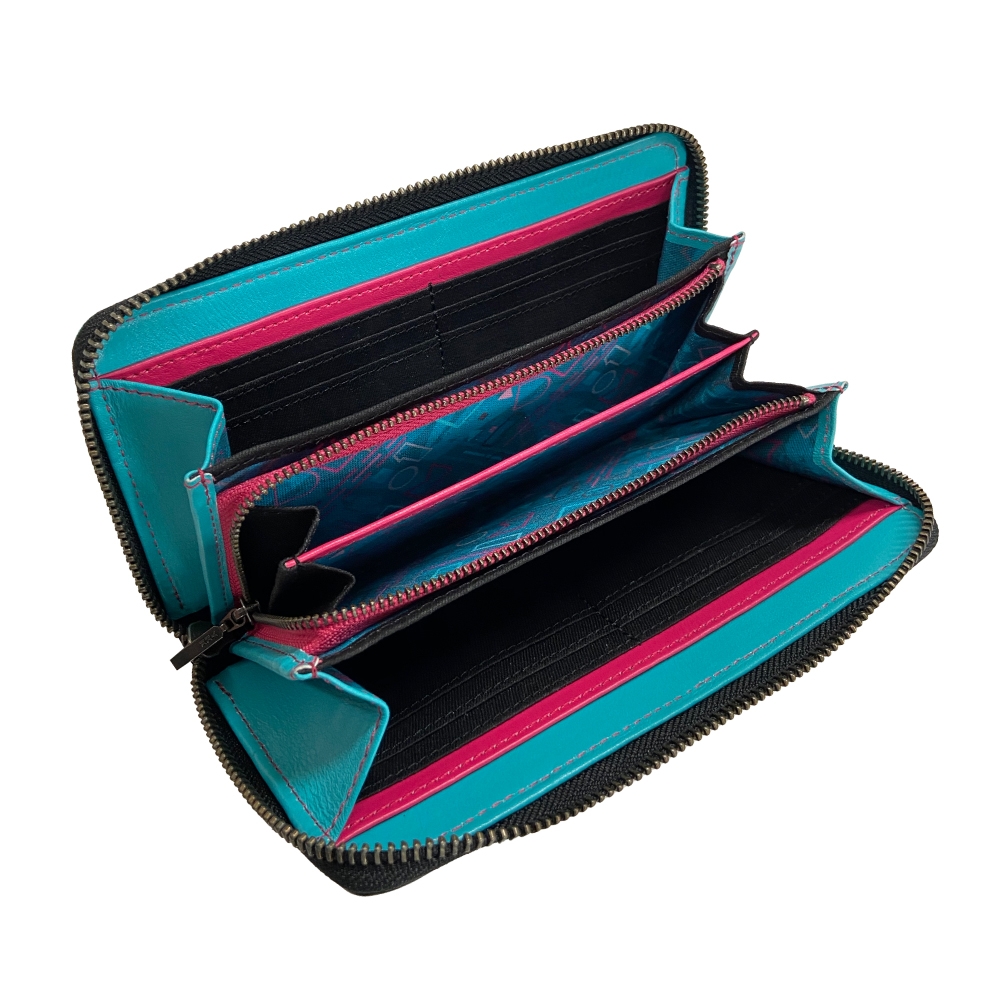 財布の落下防止、盗難防止にも役立つミクカラーの本革ウォレットコード。