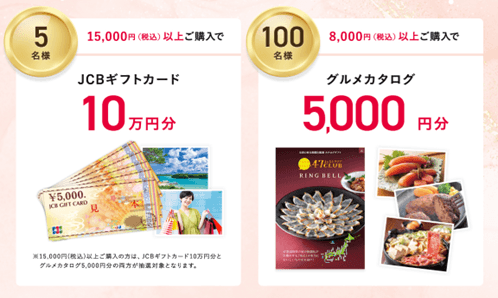 キャンペーン期間内、累計ご購入金額に応じて、抽選でギフトカードなどが当たります