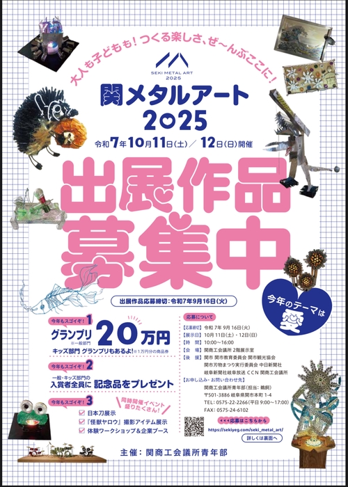 ものづくり愛の溢れるまち、岐阜県関市にて、金属加工業を始めとした事業者と将来を担う子どもたちを結びつける「関メタルアート2025」(主催:関商工会議所青年部)が2025年10月11日(土)、10月12日(日)に開催されます。本展を共に創り上げる出展作品を全国から広く募集しています。