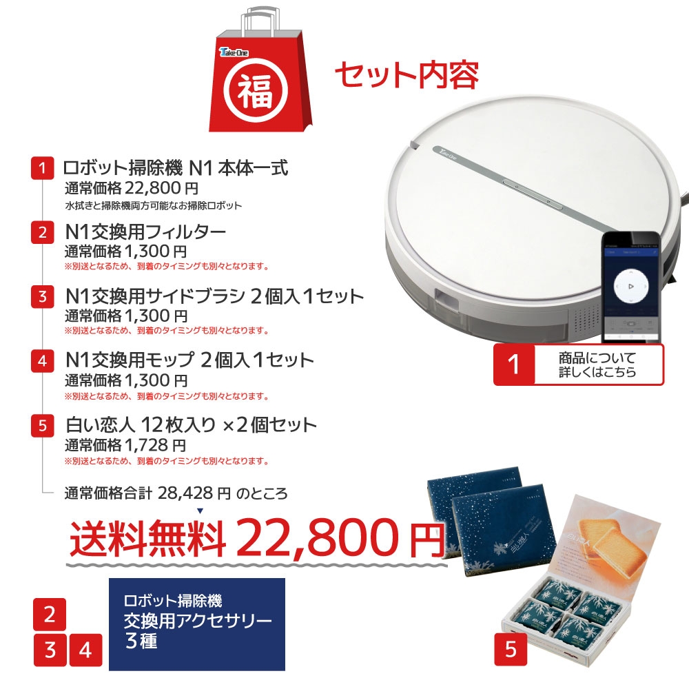 通常清掃に加え、水拭きまで可能な人気のロボット掃除機 N1(エヌワン)に白い恋人や六花亭バターサンドなど北海道ご当地お菓子をセットにした豪華福袋を販売いたします。