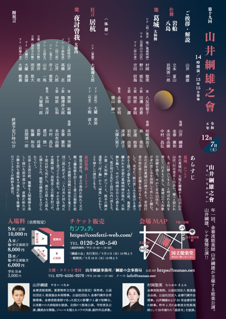 金春流 能楽公演「第19回 山井綱雄之會」チケット好評発売中! 山井綱雄が『夜討曽我 大藤内』を、村岡聖美が『葛城 大和舞』を演じる!