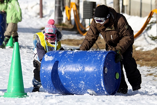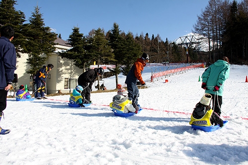 今回で3回目を迎えるこのイベントは、親子2人1組で参加できる参加費無料の運動会で、開催毎に参加希望者も増え、ふじてんの人気イベントの一つとして定着してきました。今シーズンはどなたにも上位入賞のチャンスがあるように競技内容を一部変更し、そり競争・二人三脚競争・樽ころがし・雪上ぐるぐるバットの計4種目の競技を行い、合計ポイントで競い合っていただきます。