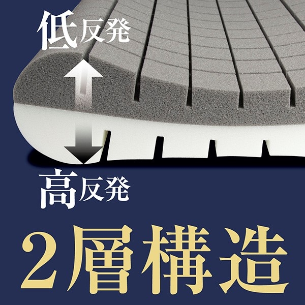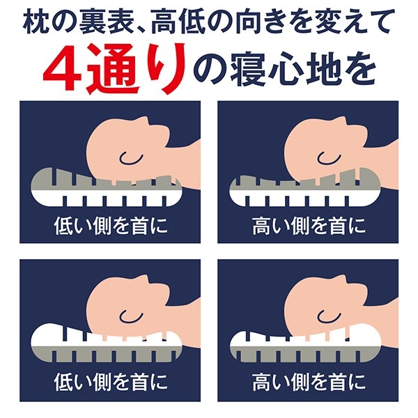 低反発が頭の形に合わせて沈み込み高反発で底つきが無いようにしっかり支えるため、寝返りが打ちやすくリラックスした体勢となることで翌朝のスッキリ感の違いを感じて頂けるよう素材と形状を工夫しました。上下で異なるウレタンを採用し低反発ウレタンで頭を優しく包み込み、高反発ウレタンで頭をしっかりと支えます。それぞれの特性を持つ贅沢な仕上がりの枕でお好みの硬さを選んで理想の寝姿勢を目指せる枕です。
