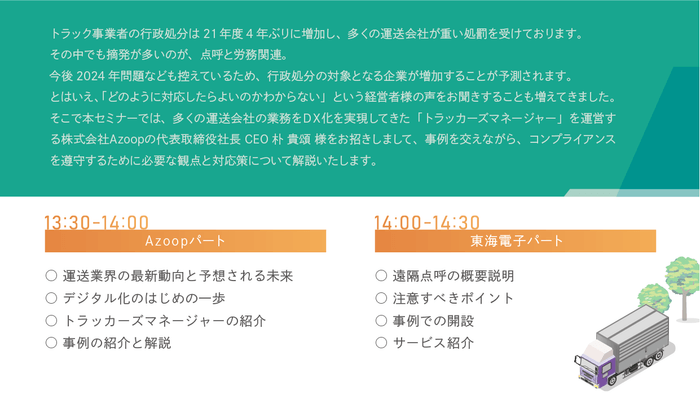【Azoop×東海電子合同ウェビナー】運送業界のコンプライアンス対応待ったなし!~点呼と労務管理 行政処分から会社を守るための対応策~10月19日(水)無料開催のお知らせ