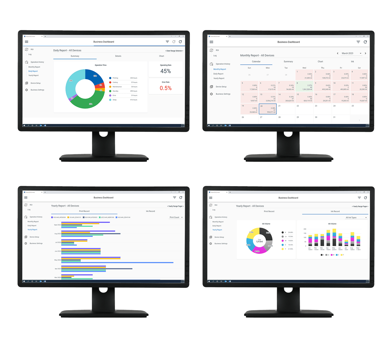 ひとつめは、さまざまなデータを多角的に分析できるよう機能拡張した「ビジネスダッシュボード」です。複数のプリンターのインク消費量、印刷時間、出力平米数、使用時間の詳細情報や、目標稼働率の達成度などを可視化できるようになるため、より収益性の高いビジネスプランの策定をはじめ、効率的なマネジメントや無駄のない在庫管理にご活用いただけます。