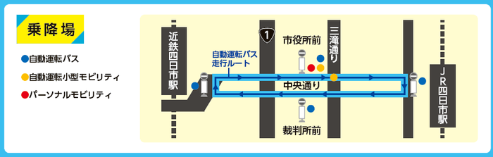■走行ルート: 「JR四日市駅前ロータリー」と「近鉄四日市駅前ロータリー」を往復する周回ルート(片道約1.1km)