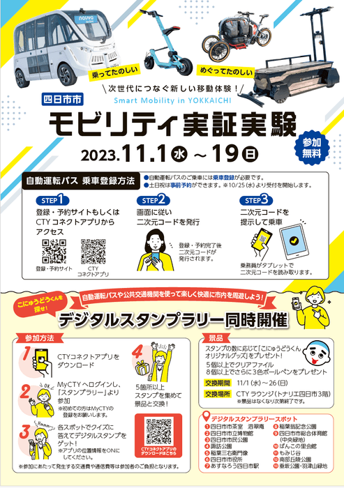 四日市市では、各種公共交通の一括予約・決済システムと駐車場予約などの機能を組み合わせた拡張型MaaSの構築を目指しています。そして、本年度5月には国土交通省の「R5年度スマートシティ実装化支援事業」に採択され、実証事業の一つとして四日市版MaaSの構築を進めています。これに伴い、本年度は自動運転実証実験と同時に、デジタルスタンプラリーを活用したMaaS実証実験を行います。デジタルスタンプラリーでは、デジタルマップ上に自動運転バス・三重交通バスの走行位置やパーソナルモビリティの乗降場を重畳することでモビリティの利用を促し、中央通り周辺における来訪者の回遊性向上、賑わいの創出を検証します。